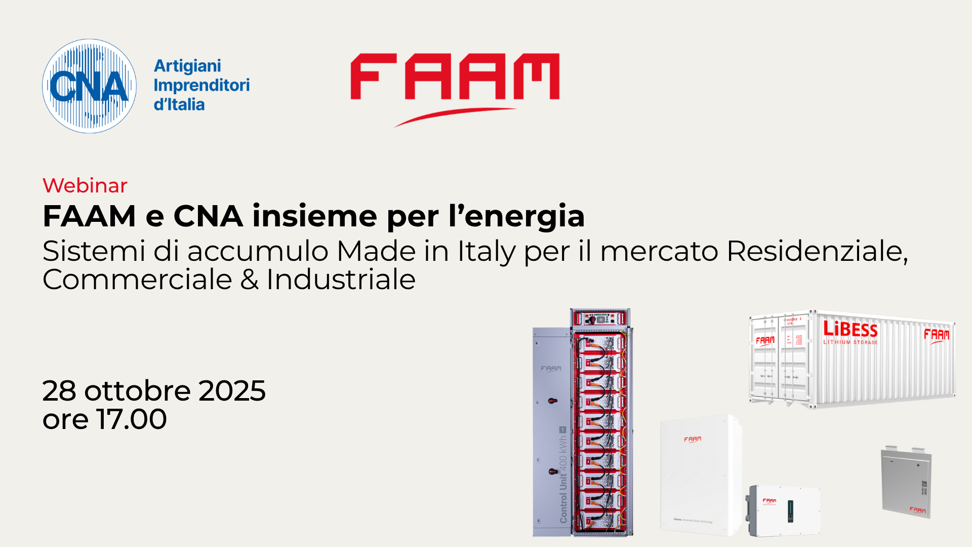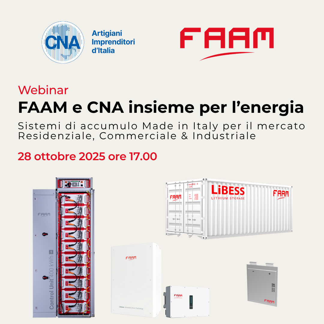 CNA, in collaborazione con FAAM, azienda italiana leader nella produzione di sistemi di accumulo energetico, organizza un webinar dedicato alle nuove soluzioni di accumulo Made in Italy e alla presentazione del protocollo di intesa siglato tra CNA e FAAM per la promozione, la formazione e l’assistenza tecnica alle imprese del settore.