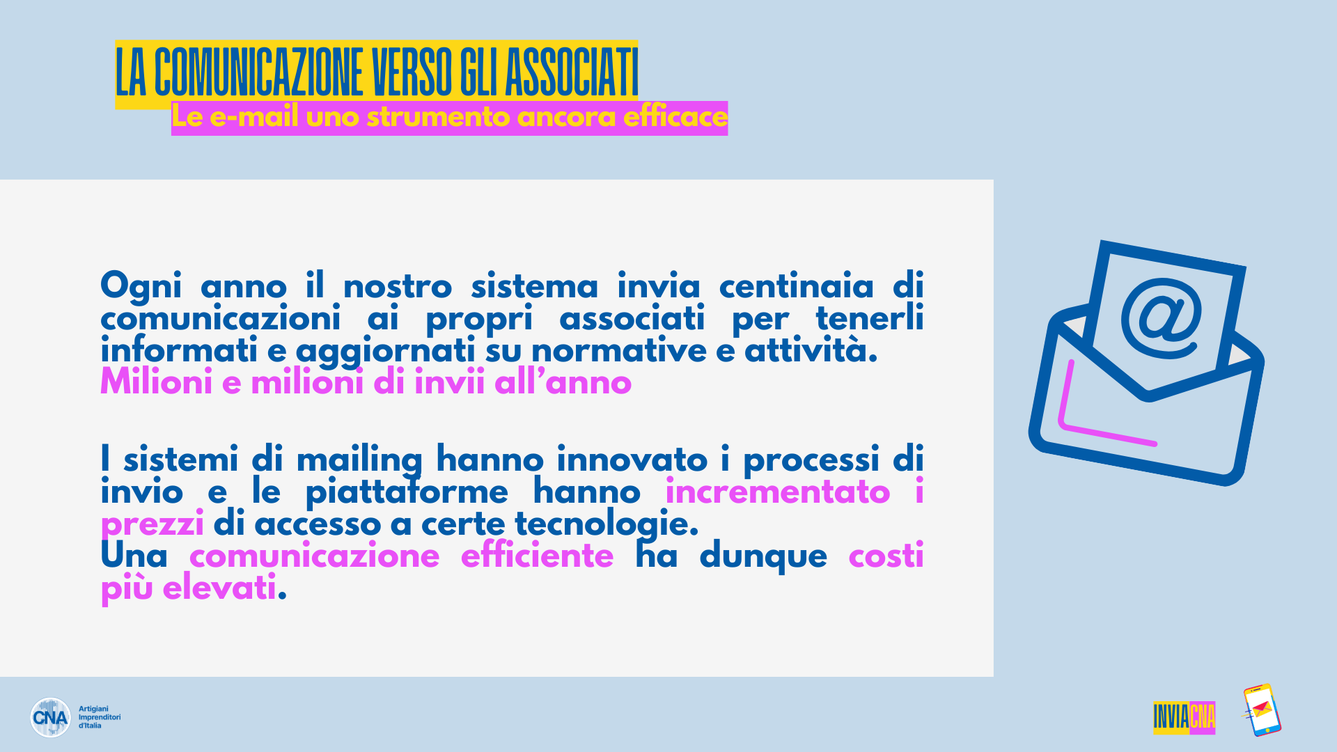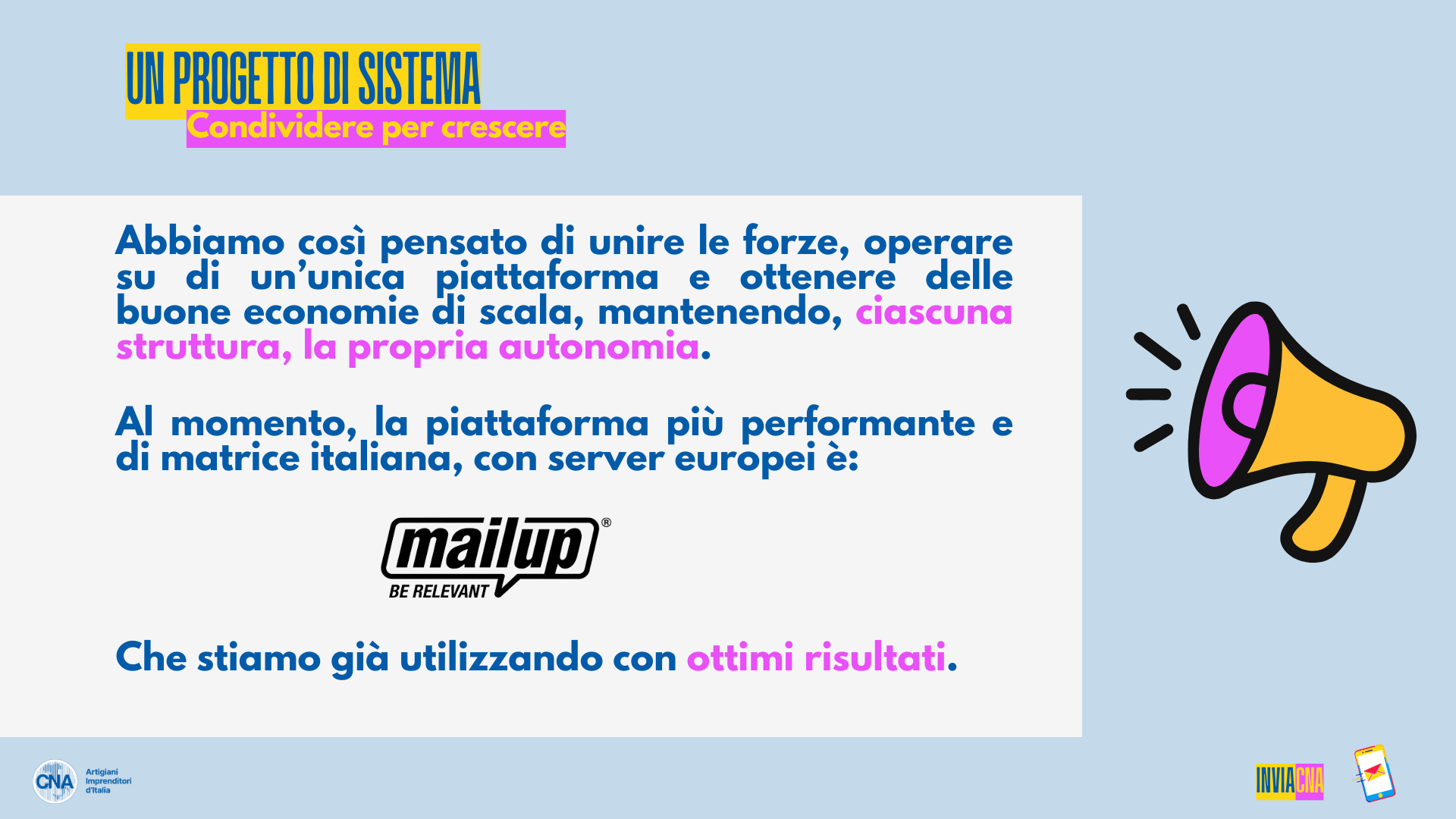 Sappiamo bene che una comunicazione efficace ha costi elevati. Abbiamo, quindi, pensato di unire le forze e fare Sistema operando su un’unica piattaforma per ottenere delle buone economie di scala. Ciascuna struttura CNA può mantenere la propria autonomia e avere…MAILUP: una piattaforma performante (di matrice italiana, con server europei) abbattendo i costi!
