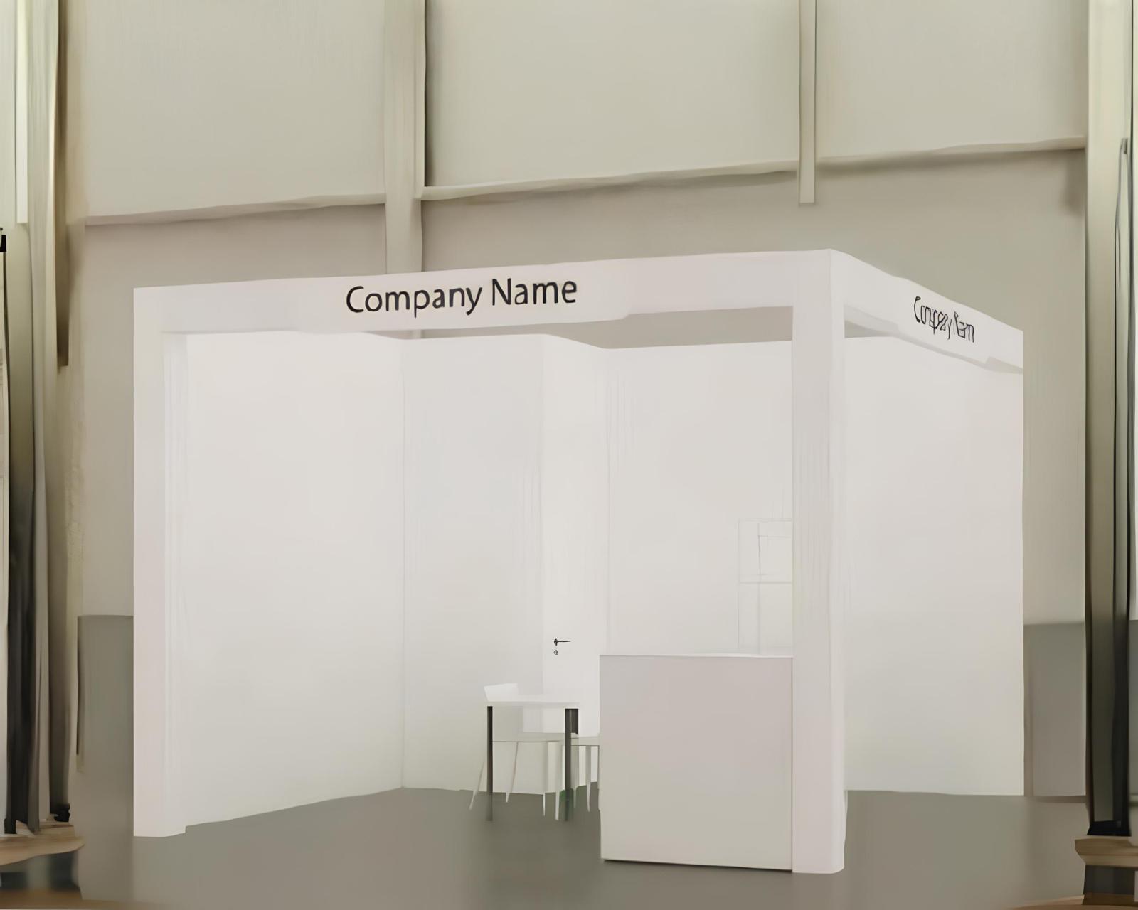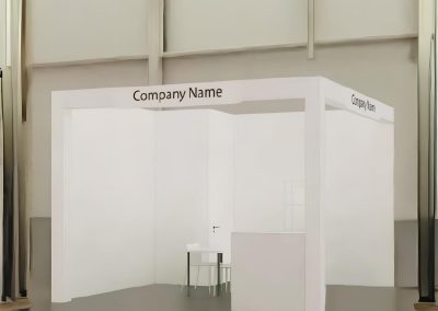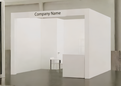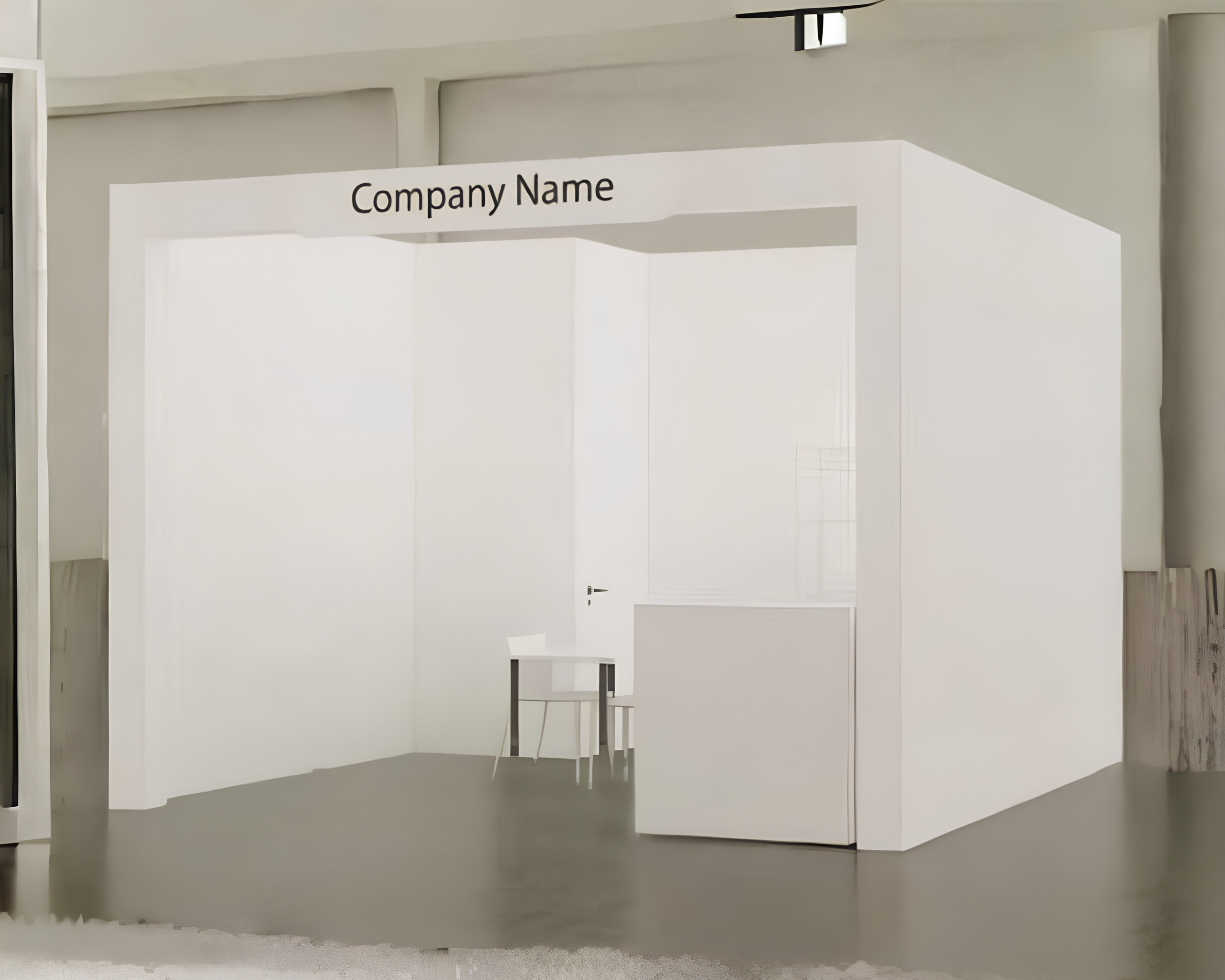Allestimento completo 9 mq in collettiva con magazzino, desk reception, 1 sgabello, tavolo e due sedie, 3 fari spot, 1 multipresa, 1 cestino, magazzino e nome azienda sul frontalino.